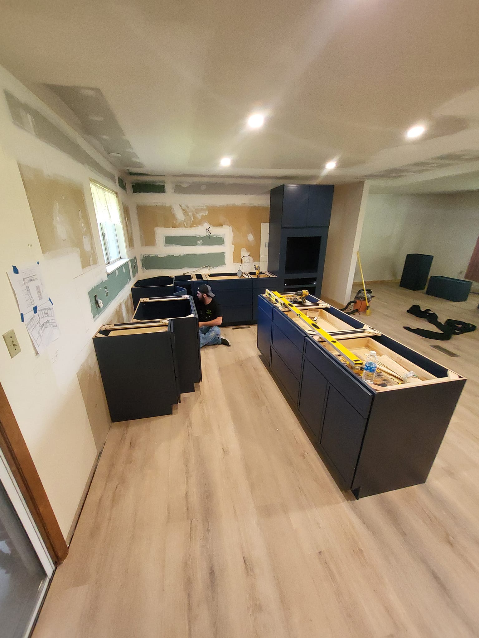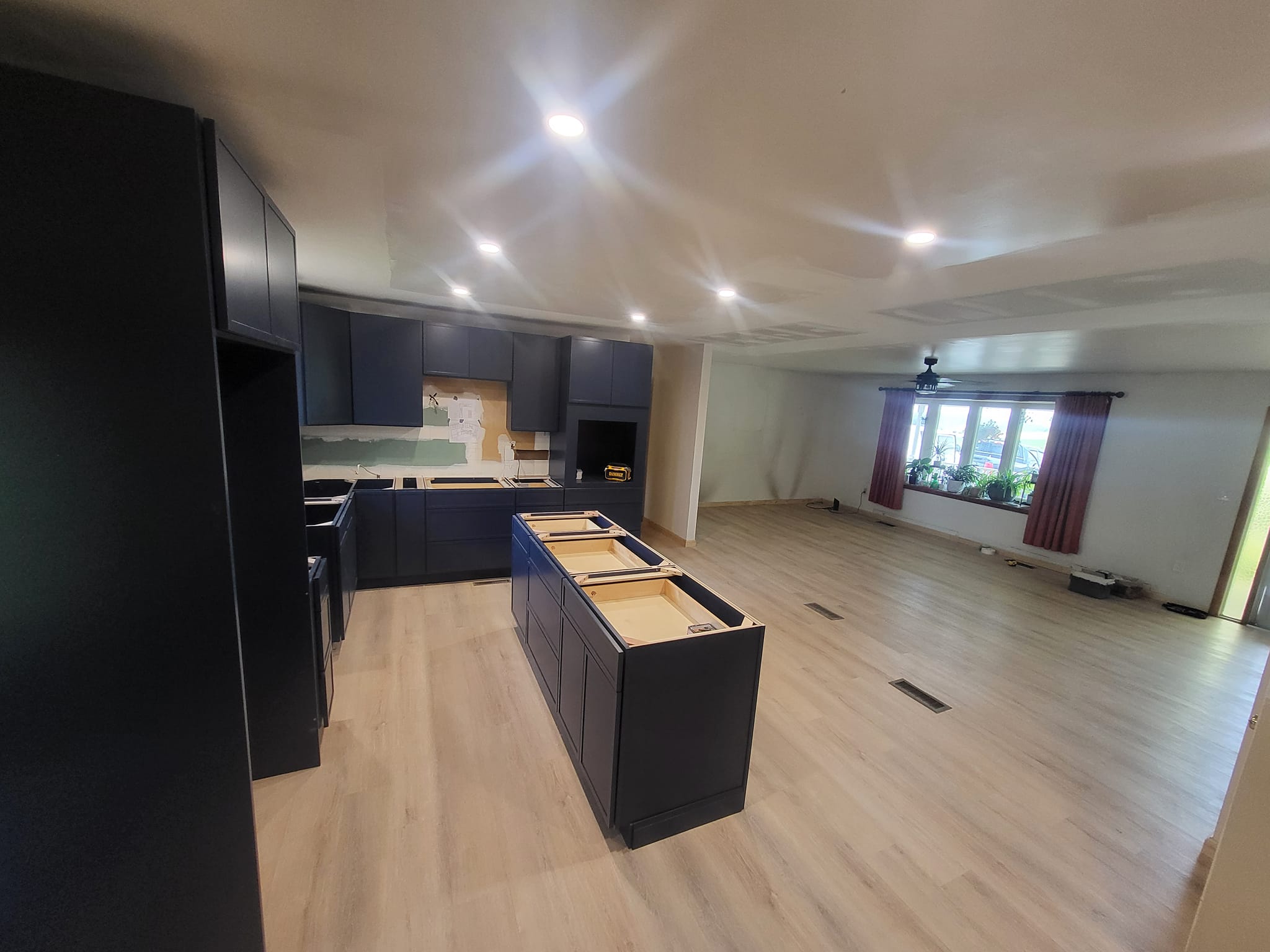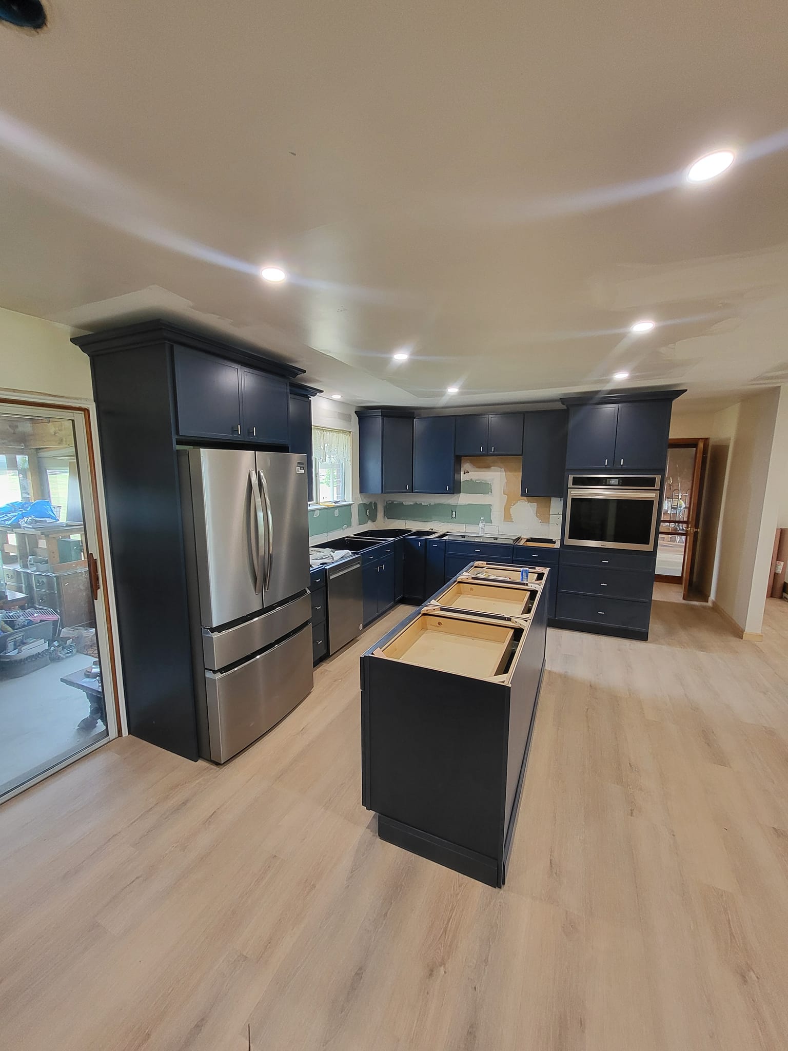 LR Contracting completed a full kitchen remodel, including reworking the layout, updating electrical and lighting, and installing new cabinetry, countertops, and flooring. We added a large central island to create additional prep space and casual seating, upgraded to modern appliances, and finished the room with clean, contemporary trim and details.