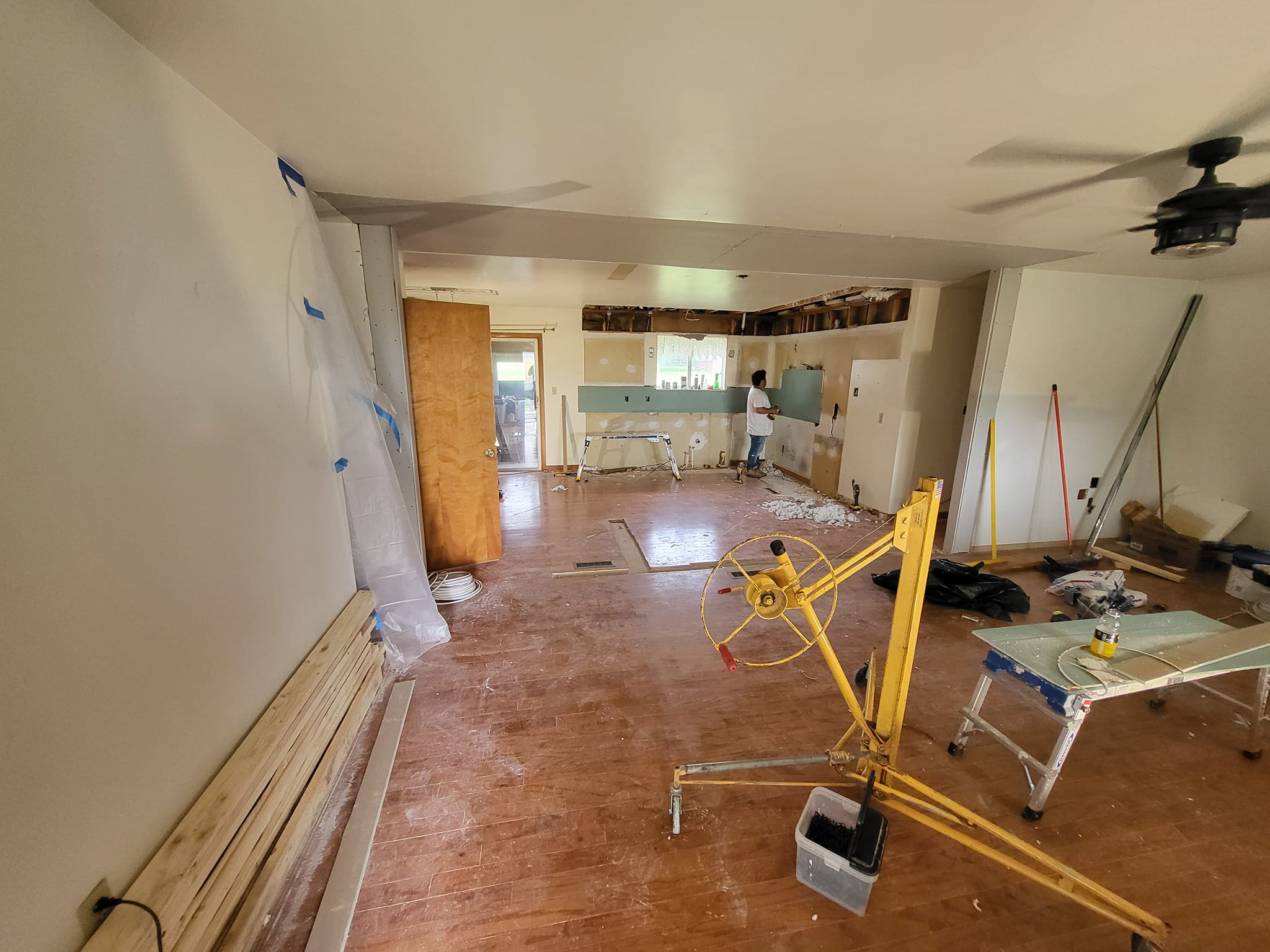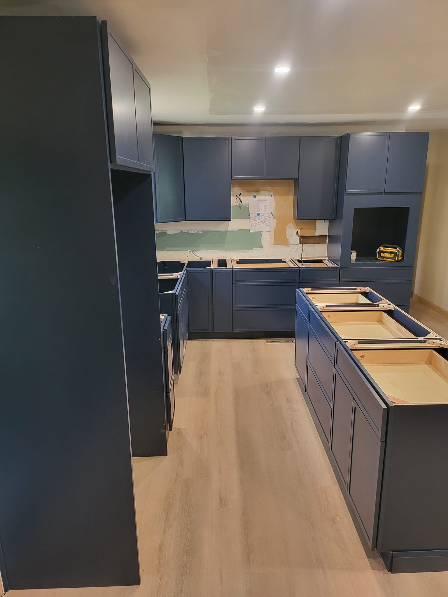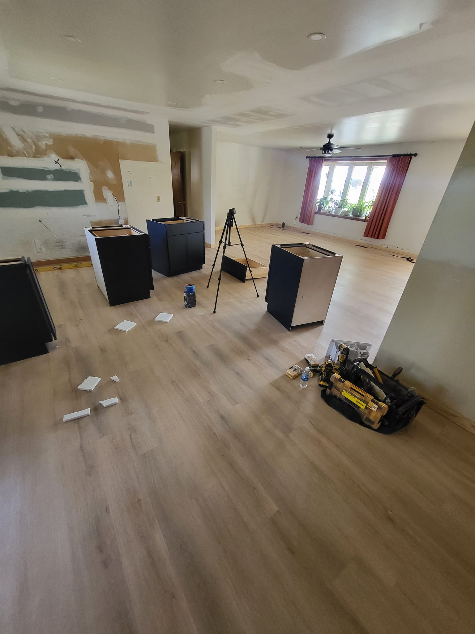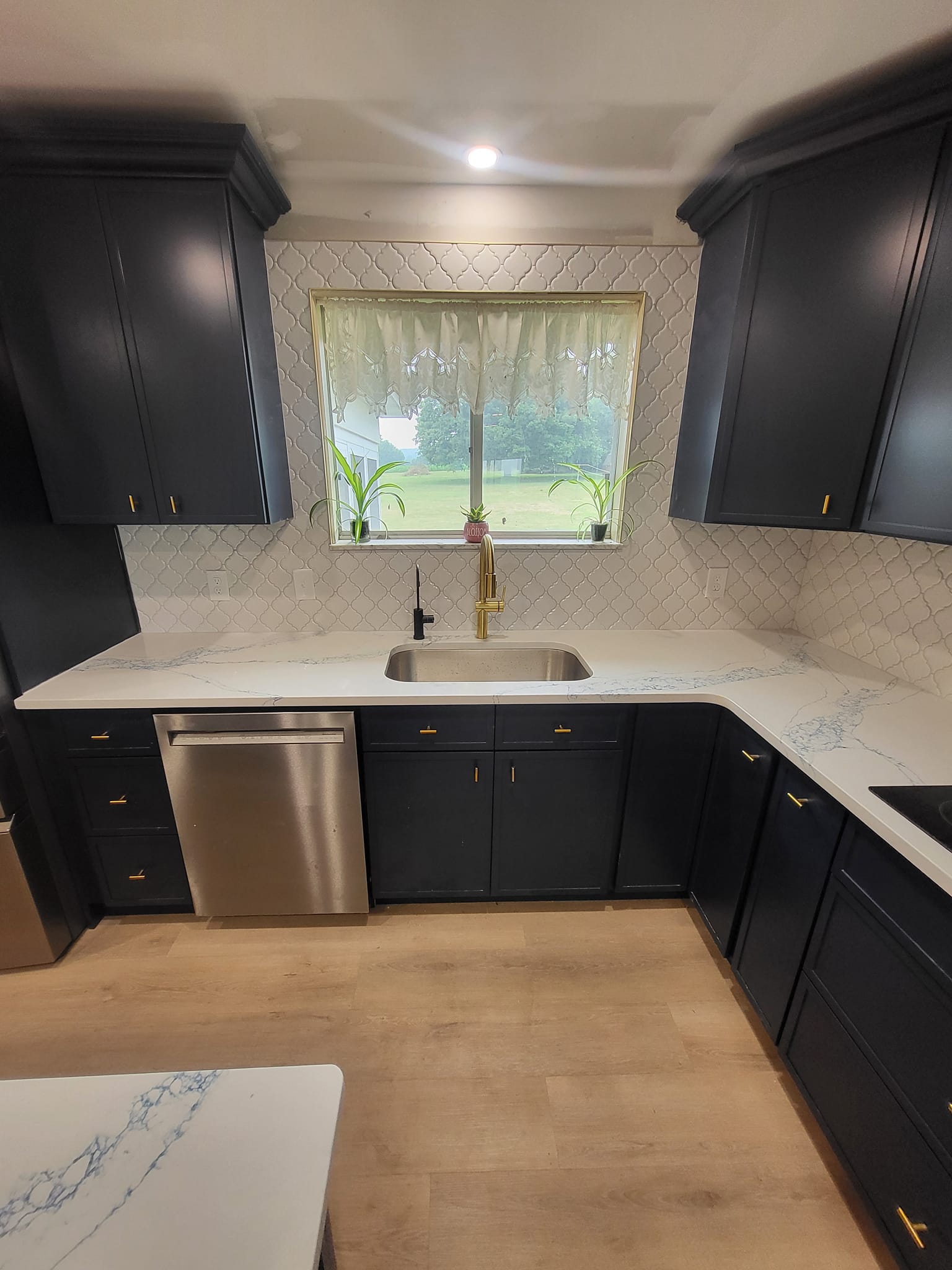 LR Contracting completed a full kitchen remodel, including reworking the layout, updating electrical and lighting, and installing new cabinetry, countertops, and flooring. We added a large central island to create additional prep space and casual seating, upgraded to modern appliances, and finished the room with clean, contemporary trim and details.